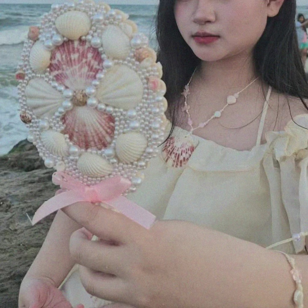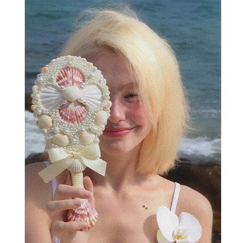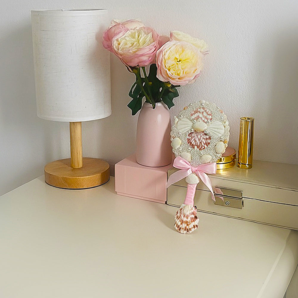 This graceful hand mirror is entirely handcrafted from natural seashells and delicate faux pearls, creating a romantic and refined design inspired by the gentle beauty of the ocean.